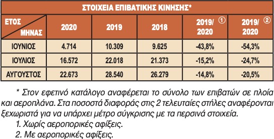 Όσον αφορά το νησί μας, τα στοιχεία αφίξεων επιβατών με πλοία, γιατί στα αεροπλάνα η κίνηση είναι πάντα χαμηλή, τώρα δε ακόμη περισσότερο, δείχνουν να έχουμε μεν μεγάλη μείωση τον Ιούνιο, μήνας στον οποίο η πτώση ξεπερνά το 50%, παράλληλα όμως, να κρατούν σχετικά καλά ο Ιούλιος, με πτώση περίπου 25% και ο Αύγουστος με 31%.