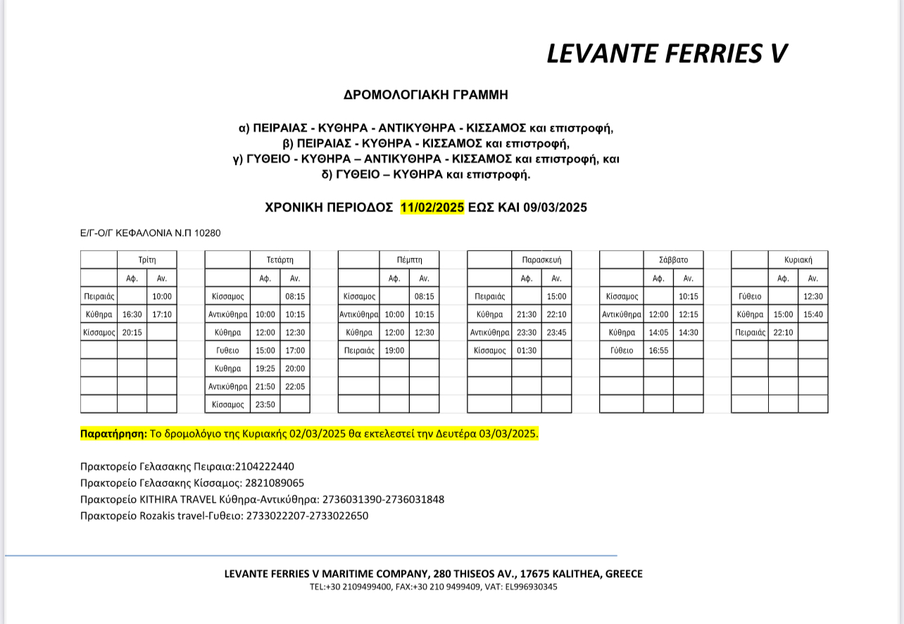 ΔΡΟΜΟΛΟΓΙΑ LEVANTE FERRIES 11/02/2025 – 02/03/2025