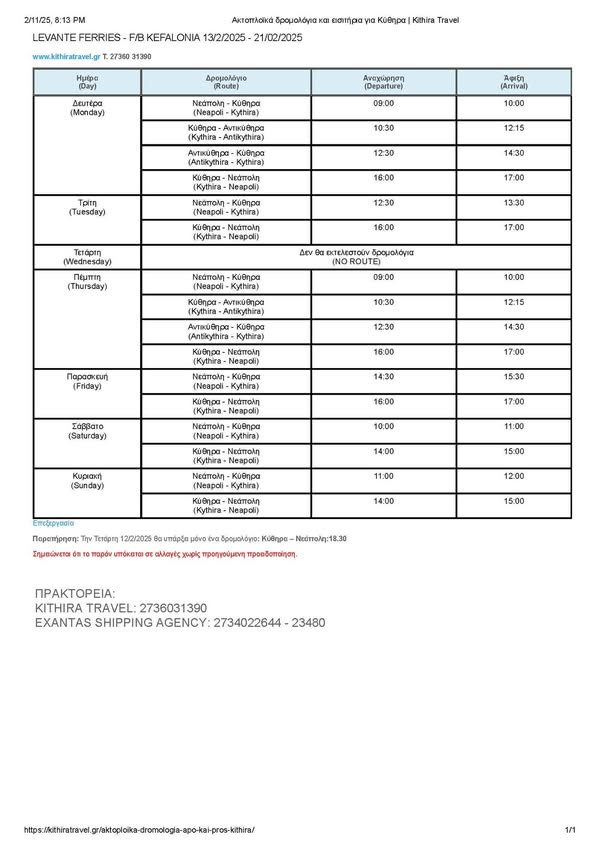 ΔΡΟΜΟΛΟΓΙΑ ΠΛΟΙΟΥ «ΚEΦΑΛΟΝΙΑ» ΑΠΟ ΝΕΑΠΟΛΗ