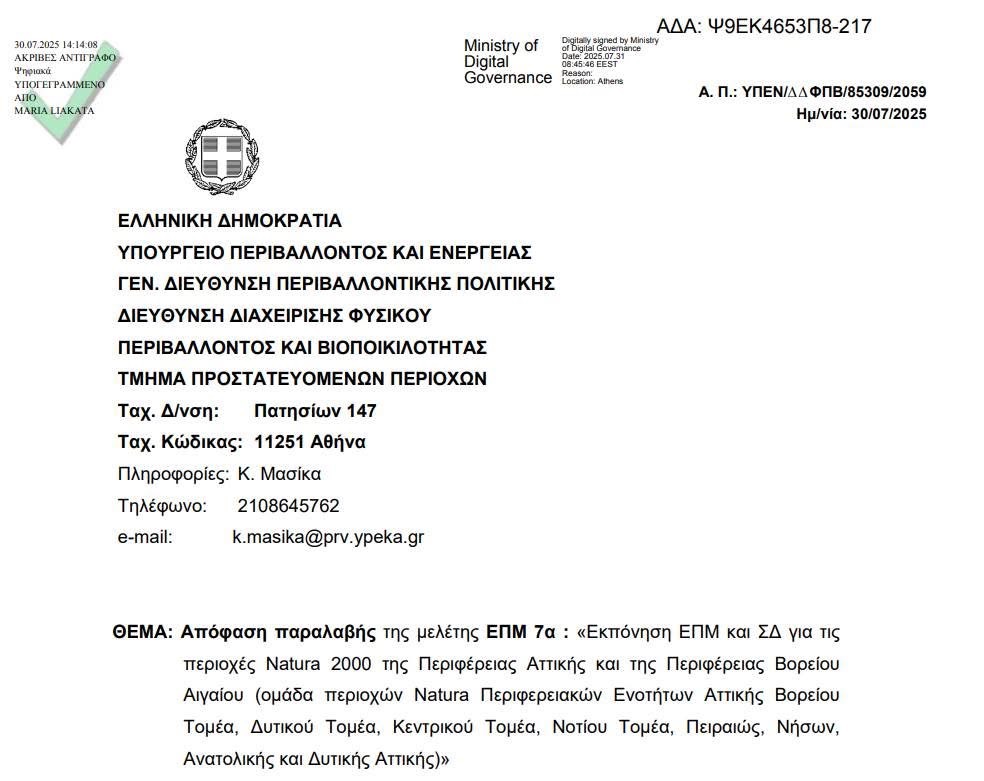 Σήμερα 31-7-2025 ο Γενικός Διευθυντής Περιβαλλοντικής Πολιτικής (ΔΙΠΑ) του ΥΠΕΝ Κωνσταντίνος Δημόπουλος, με απόφαση που αναρτάται στη ΔΙΑΥΓΕΙΑ αποφασίζει να παραλάβει την μελέτη ΕΠΜ 7α “Εκπόνηση ΕΠΜ και ΣΔ για τις περιοχές Natura 2000 της ΠΕΡΙΦΕΡΕΙΑΣ ΑΤΤΙΚΗΣ και της Περιφέρειας Βορείου Αιγαίου (ομάδα περιοχών Natura Περιφερειακών Ενοτήτων Αττικής Βορείου Τομέα, Δυτικού Τομέα, Κεντρικού Τομέα, Νοτίου Τομέα, Πειραιώς, Νήσων, Ανατολικής και Δυτικής Αττικής)”