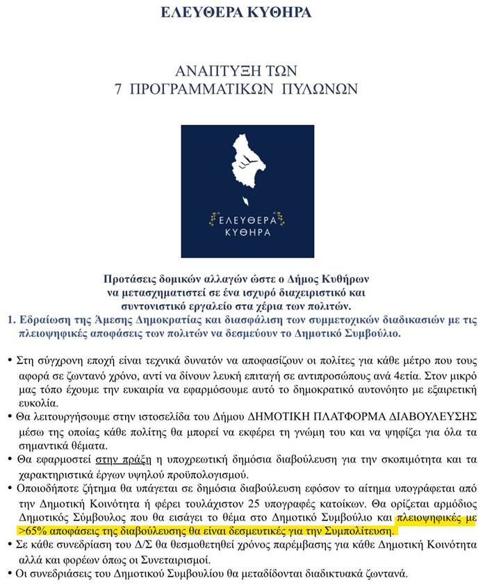 Πριν από 2 χρόνια, στον πρώτο μάλιστα από τους προγραμματικούς μας πυλώνες, προτείναμε οι πλειοψηφικές αποφάσεις των πολιτών να είναι δεσμευτικές για το Δημοτικό Συμβούλιο. Αυτή η δέσμευση, για εμάς προϊόν βιωματικής ανάλυσης του αντιδημοκρατικού τρόπου διοίκησης, ανάγκασε τους άλλους συνδυασμούς να προσθέσουν στην προεκλογική τους ρητορική πομπώδεις (ψευδείς, όπως αποδείχτηκε) διατυπώσεις περί συμμετοχής των πολιτών, όπως (Χαρχαλάκης): «Το κάλεσμά μας είναι διαρκές σε μια προσπάθεια να ενθαρρύνουμε την κοινωνική συμμετοχή και την αυτοδιάθεση. Θέλουμε τους πολίτες πρωταγωνιστές και συμμάχους μας.» και (Σουρής): «Σε αντίθεση με τη σημερινή αυταρχική προσέγγιση του «έχω την πλειοψηφία – κάνω ό,τι θέλω», η δική μας προσέγγιση στοχεύει στην επιδίωξη μέγιστης συναίνεσης μέσα από δημοκρατικές διαδικασίες παντού (Δημοτικό Συμβούλιο, Τοπικά Συμβούλια, πραγματικά ανοιχτή διαβούλευση στις Τοπικές Κοινότητες)». Έτσι, για τα πρακτικά. (βλ. φώτο 1)