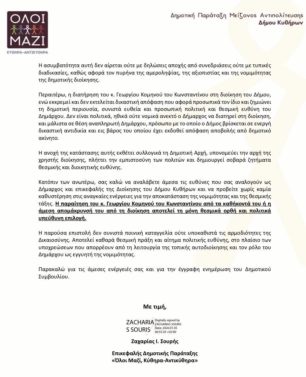 Η παράταξη «Όλοι Μαζί, Κύθηρα – Αντικύθηρα» καλεί τον Δήμαρχο να αναλάβει άμεσα τις θεσμικές και πολιτικές του ευθύνες και να προβεί χωρίς καμία καθυστέρηση στις αναγκαίες ενέργειες για την αποκατάσταση της νομιμότητας και της θεσμικής τάξης. Η παραίτηση ή απομάκρυνση του Αντιδημάρχου από τη διοίκηση αποτελεί τη μόνη θεσμικά ορθή και πολιτικά υπεύθυνη επιλογή.