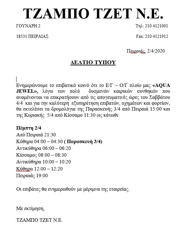 - ΔΤ – Τροποποίηση δρομολογίων Aqua Jewel