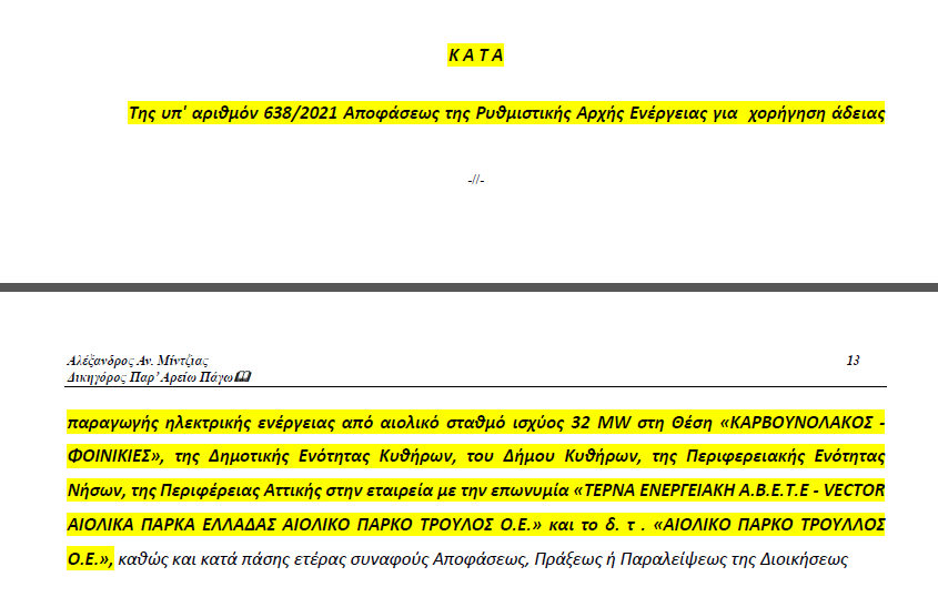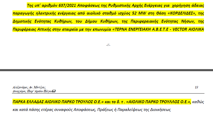 Η εκδίκαση των αιτήσεων ακύρωσης του ΚΙΠΑ, πλήθους σωματείων και κατοίκων του νησιού κατά των αποφάσεων της Ρυθμιστικής Αρχής Ενέργειας για τα 3 έργα συμφερόντων της εταιρείαςΤΕΡΝΑ πήρε εκ νεόυ αναβολή λόγω των πρόσφατων εκλογών.