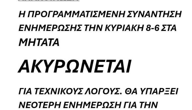 Η ΠΡΟΓΡΑΜΜΑΤΙΣΜΕΝΗ ΣΥΝΑΝΤΗΣΗ ΕΝΗΜΕΡΩΣΗΣ ΤΗΝ ΚΥΡΙΑΚΗ 8-6 ΣΤΑ ΜΗΤΑΤΑ