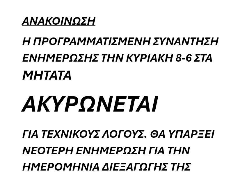 ΓΙΑ ΤΕΧΝΙΚΟΥΣ ΛΟΓΟΥΣ. ΘΑ ΥΠΑΡΞΕΙ ΝΕΟΤΕΡΗ ΕΝΗΜΕΡΩΣΗ ΓΙΑ ΤΗΝ ΗΜΕΡΟΜΗΝΙΑ ΔΙΕΞΑΓΩΓΗΣ ΤΗΣ