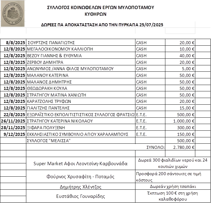 Ιδιαίτερες ευχαριστίες στους Φορείς και τους Συλλόγους των Κυθήρων που συνέβαλλαν οικονομικά στην ίδια προσπάθεια, αλλά και στους επαγγελματίες του νησιού για την εις είδος συνεισφορά τους.