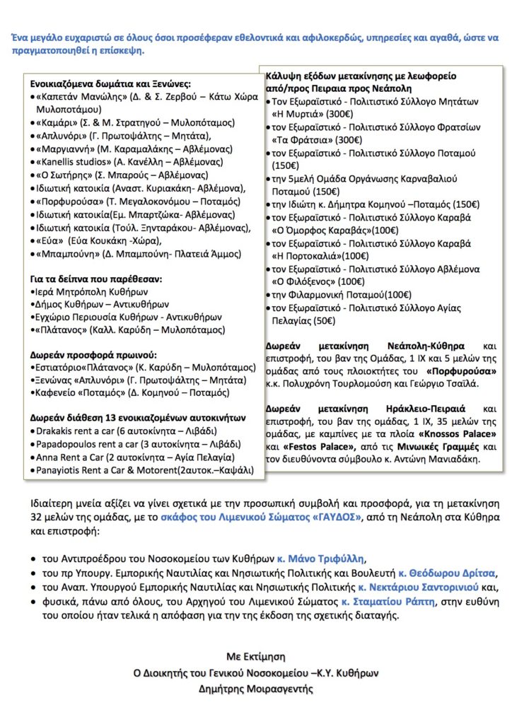 - Ευχαριστήριο από Νοσοκομείο Κυθήρων προς ‘Γιατρούς του Αιγαίου-ΠΑΓΝΗ’