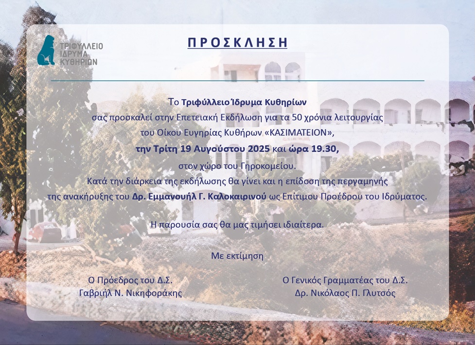 - Εκδήλωση για τα 50 χρόνια του Γηροκομείου Κυθήρων και ανακήρυξης του τ. Προέδρου του Τριφυλλείου Ιδρύματος κ. Εμμ. Καλοκαιρινού σε Επίτιμο Πρόεδρο
