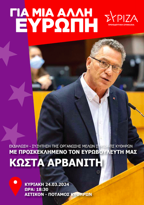 Σας ενημερώνουμε ότι στις 24 Μαρτίου και ώρα 18:30 θα πραγματοποιηθεί εκδήλωση – συζήτηση της Οργάνωσής μας με προσκεκλημένο τον Έλληνα Ευρωβουλευτή και μέλος της Ευρομάδας του ΣΥΡΙΖΑ – ΠΣ και της της Ευρωπαϊκής Αριστεράς Κώστα Αρβανίτη στον Ποταμό Κυθήρων, στο Καφέ Αστικόν.