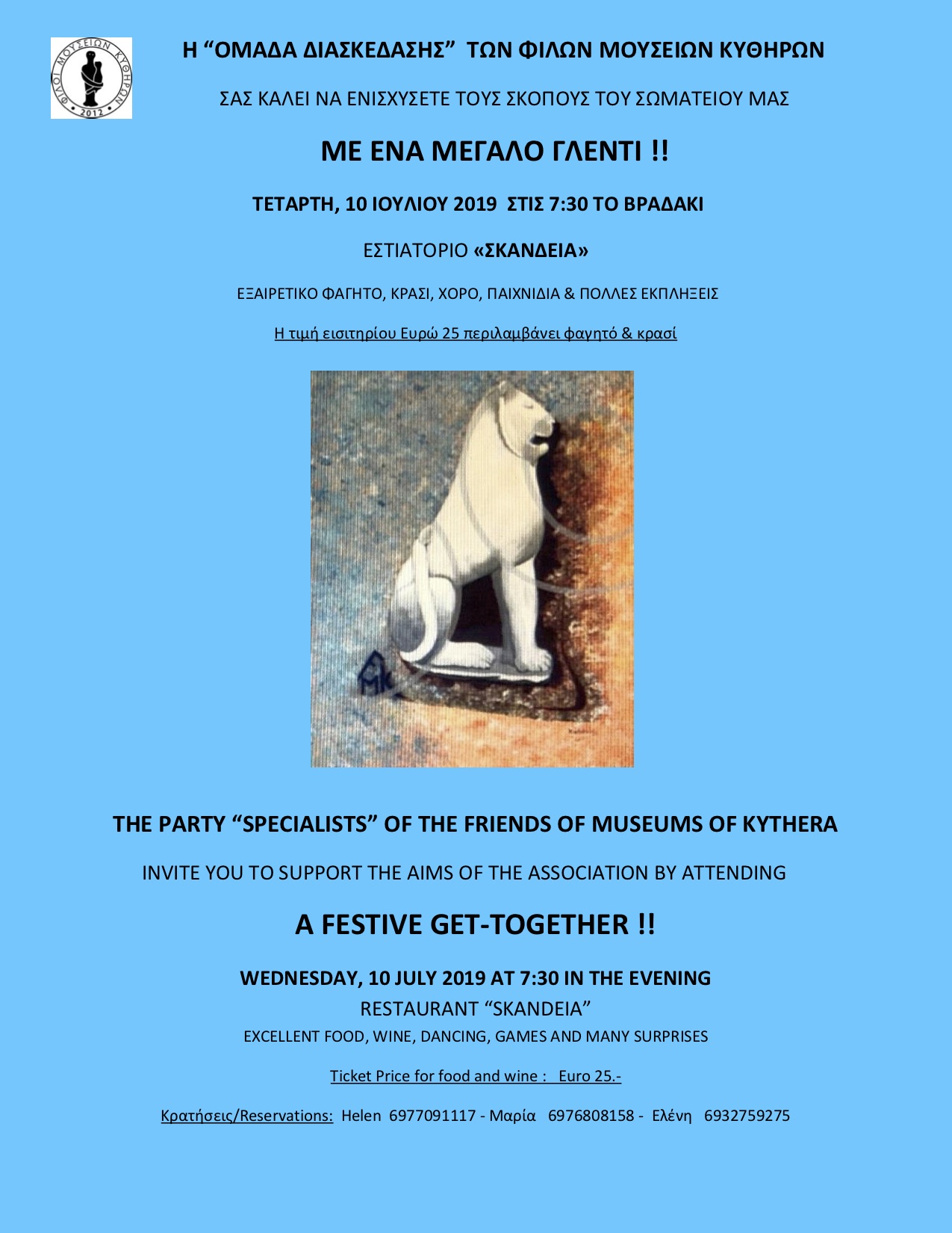 Αγαπητά μέλη των ΦΜΚ με επικεφαλής τον κύριο Stuart Fleming, πρότειναν και ανέλαβαν την οργάνωση αυτής της διασκεδαστικής βραδιάς στο Εστιατόριο Σκάνδεια.  Σκοπός είναι να ενισχυθεί το ταμείο μας για να φέρουμε σε πέρας τον επόμενο στόχο μας.