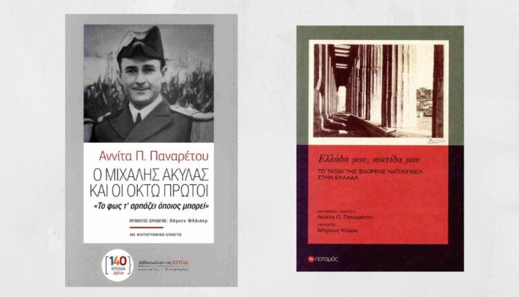 Δύο βιβλία εκδόθηκαν πρόσφατα από την εξαιρετική ερευνήτρια, την Κυθηρία φιλόλογο Αννίτα Παναρέτου. Το πρώτο βιβλίο της έχει τίτλο « Ο Μιχάλης Ακύλας και οι οκτώ πρώτοι» και υπότιτλο: «Το φως τ΄ αρπάζει όποιος μπορεί». Το βιβλίο, που εκδόθηκε από τις εκδόσεις ΕΣΤΙΑΣ ανήκει στις μαρτυρίες-βιογραφίες και περιγράφει την πορεία ενός από τους πρώτους εκτελεσθέντες από τους Γερμανούς στην Κατοχή, του σαραντάχρονου αξιωματικού του Ναυτικού Μιχάλη Ακύλα, που έπεσε μαζί με άλλους 8 πατριώτες στις 5 Ιουνίου 1942 στην Καισαριανή, αφού πρώτα έψαλλαν τον εθνικό ύμνο και ζητωκραύγασαν υπέρ της πατρίδας. Το βιβλίο, με τις 200 σελίδες του διαβάζεται άνετα, καθώς είναι γραμμένο με τη γνωστή μαεστρία της Αννίτας, που είναι εξπέρ, ειδικά στο χειρισμό και την παρουσίαση τέτοιων θεμάτων. Αξίζει να διαβαστεί από αυτούς, που ακόμη αγαπούν το χαρτί και δεν τους έχει πάρει το χρόνο η συνεχής απασχόληση στην τοξικότητα των μέσων κοινωνικής δικτύωσης.