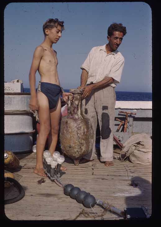 Στη φωτογραφία ο Κυθήριος ερασιτέχνης αλιεύς Γεώργ. Χαραμουντάνης με ένα αμφορέα από την έρευνα του Κουστώ πιθανότατα στα Αντικύθηρα. Η φωτογραφία πρέπει να είναι στο Καψάλι και ο νεαρός αριστερά πιθανόν να είναι ο γιος του Ζακ Υβ Κουστώ (τη φωτογραφία αλίευσε στο διαδίκτυο ο Σταμ. Γιαννιώτης, ο οποίος και μας την έστειλε)