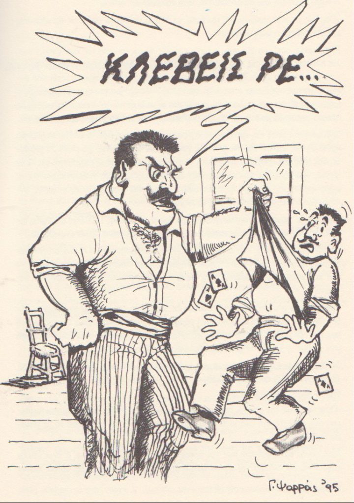 Τόπε η κακόγλωσσα κι εγίνηκε. Ένα βράδυ που είχε πάει κούτσα-κούτσα στο καφενείο κι έπαιζε χαρτία μ’ ένα ξονεμπασάρη, τότες εγίνηκε το κακό. Ήταν ένας εργάτης στην ύδρευση ο συμπαίχτης του, ένα μουντουλούνι θερίο, με μουστάκια κατσουνωτά και κάτι χερούκλες σαν το φουρνόφτυαρο φαρδιές. Βούβαλο τον είχανε παρανομιάσει. Τούτος ο Βούβαλος λοιπόν, τον εγράπωσε την ώρα που έβγανε τον άσσο από το ζουνάρι του.