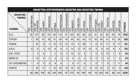 Στα Κύθηρα η συνολική εικόνα εμφανίζει παρόμοια στοιχεία και ο καθένας μπορεί να συναγάγει τα συμπεράσματά του με μία απλή ματιά στον πίνακα αποτελεσμάτων. Χαρακτηριστικά, Ν.Δ. και ΣΥΡΙΖΑ έπεσαν 3 ολόκληρες μονάδες από το Μάιο, ενώ κατά μία μονάδα αύξησαν τα ποσοστά τους Ελλ. Λύση και Νίκη με έκπληξη (;) στους πρωτοεμφανιζόμενους «Σπαρτιάτες» (ένα υποκατάσταστο της Χ.Α. ουσιαστικά) που πήραν 94 ψήφους και ήταν κοντά στο εθνικό τους ποσοστό. Καλό καλοκαίρι!