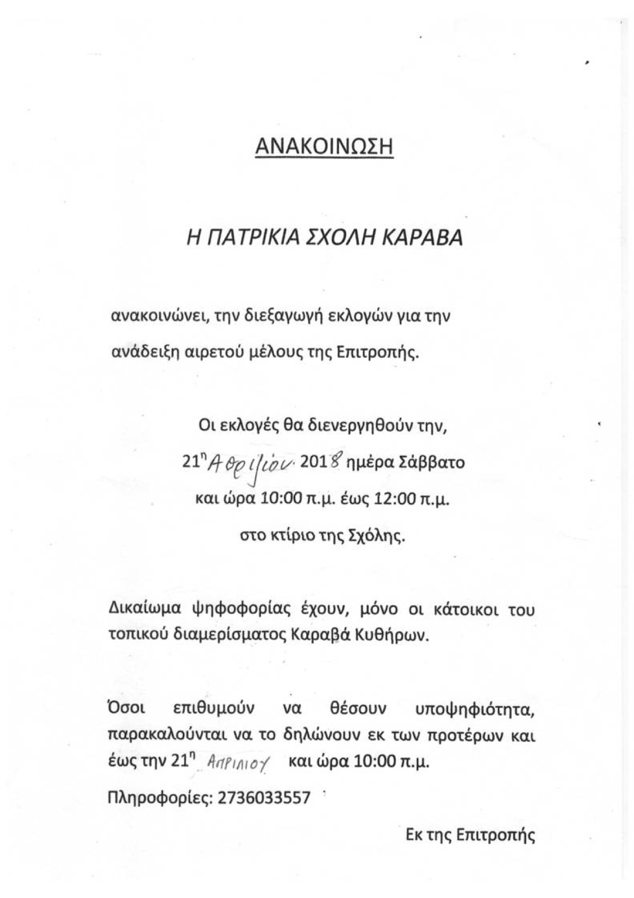 - Εκλογές Πατρικία Σχολή – 21/4/2018