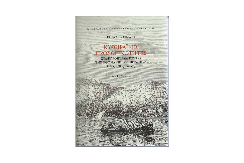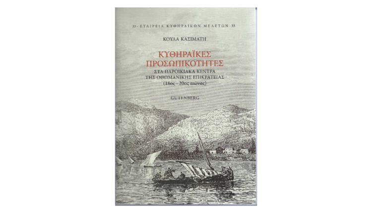 Η Ομότιμη Καθηγήτρια του Παντείου Πανεπιστημίου κυρία Κούλα Κασιμάτη έχει ασχοληθεί με την μετανάστευση των Κυθηρίων από τον 18ο αιώνα έως τις μέρες μας αναδεικνύοντας πολλές πτυχές της κυθηραϊκής ιστορίας. Το παρόν βιβλίο με τίτλο Κυθηραϊκές Προσωπικότητες στα παροικιακά κέντρα της Οθωμανικής Επικράτειας (18ος- 20ός αιώνας) σε ένα καλαίσθητο τόμο 425 σελίδων των εκδόσεων Gutenberg, συμπληρώνει την τριλογία της για τις μεταναστεύσεις των Κυθηρίων στα παροικιακά κέντρα: Σμύρνη, Αλεξάνδρεια και Κωνσταντινούπολη-Ρουμανία. Η τριλογία αυτή βραβεύθηκε από την Ακαδημία Αθηνών το 2019. Ιδιαίτερη τιμή αισθάνεται η Εταιρεία Κυθηραϊκών Μελετών δεδομένου ότι και τα τρία βιβλία, που έλαβαν μια εξόχως τιμητική διάκριση, αποτελούν εκδόσεις της.