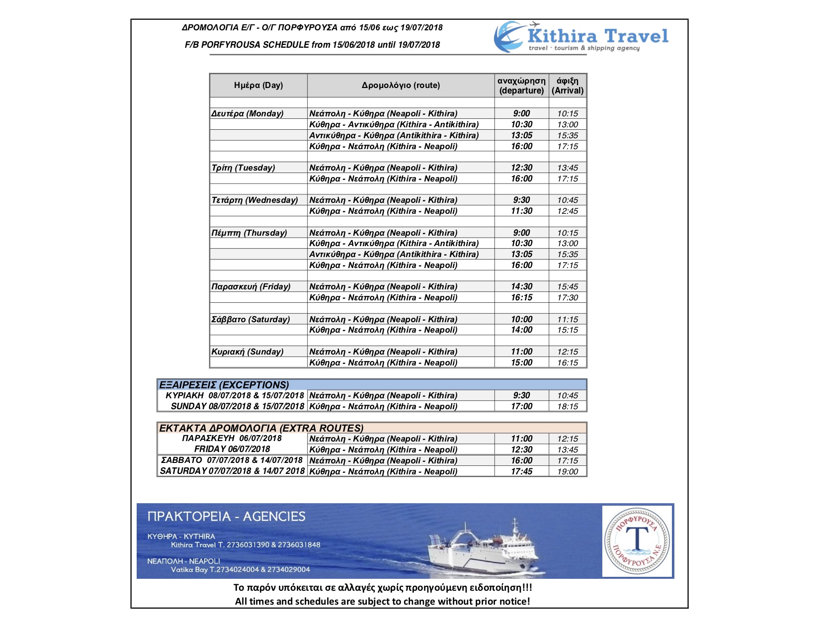 Έκτακτο δρομολόγιο Πορφυρούσα & τα Σάββατα 07/07/2018 & 14/07/2018.