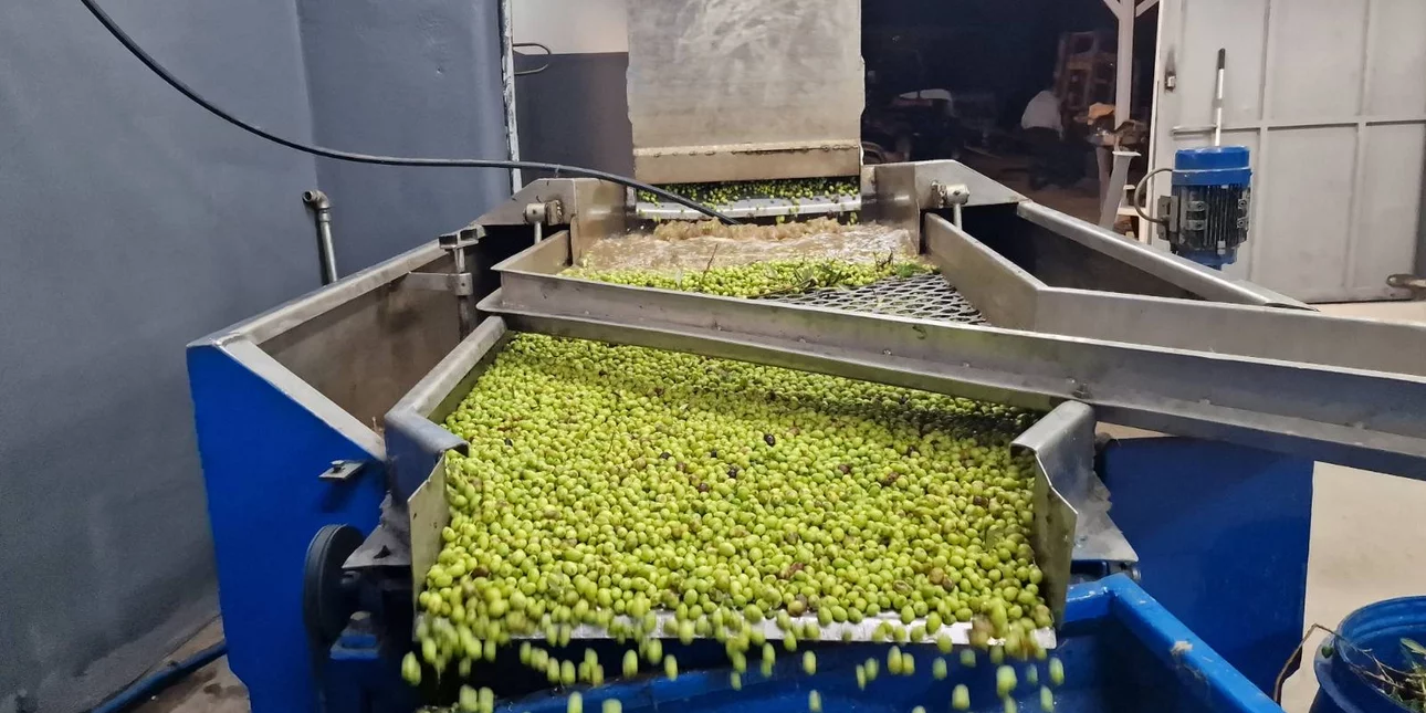 Στον προαύλιο χώρο τρακτέρ και μικροί γερανοί πηγαινοέρχονται ασταμάτητα μεταφέροντας τους σάκους με τον καρπό στο χώρο υποδοχής . Αφού πλένονται οι ελιές συνθλίβονται στο επόμενο στάδιο και η αλυσίδα των μηχανημάτων καταλήγει σε μεγάλους σωλήνες από τους οποίους τρέχει ο «πράσινος χρυσός», ο πρωταγωνιστής της μεσογειακής διατροφής.