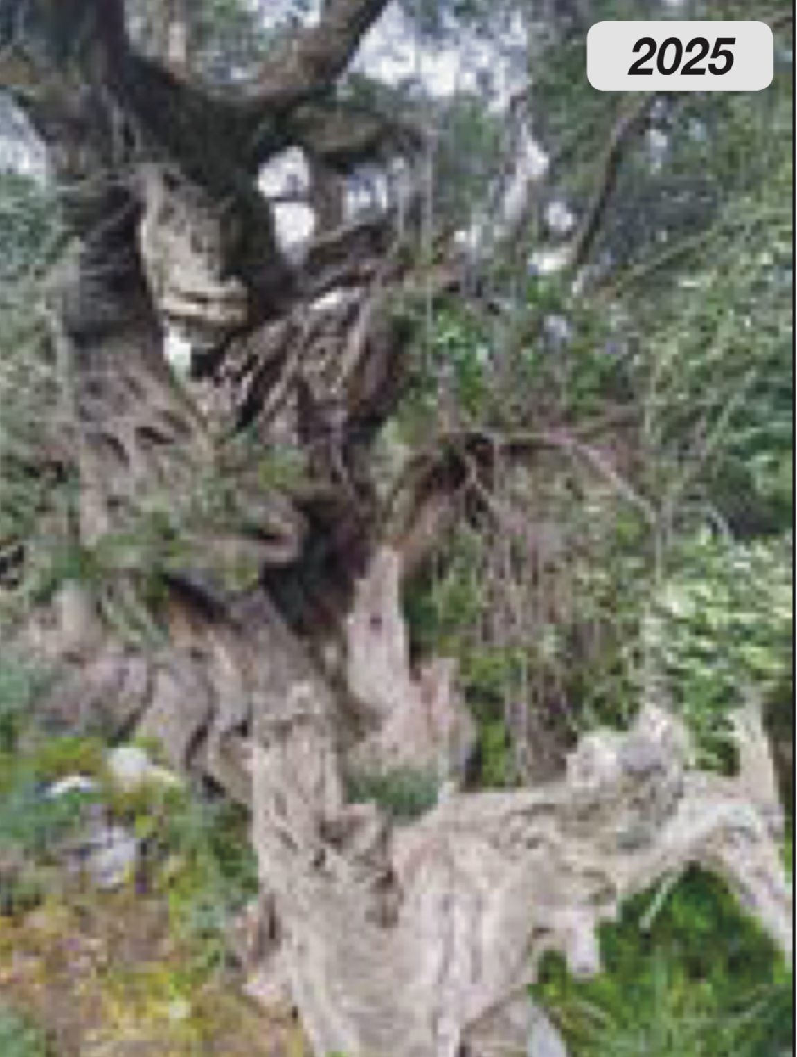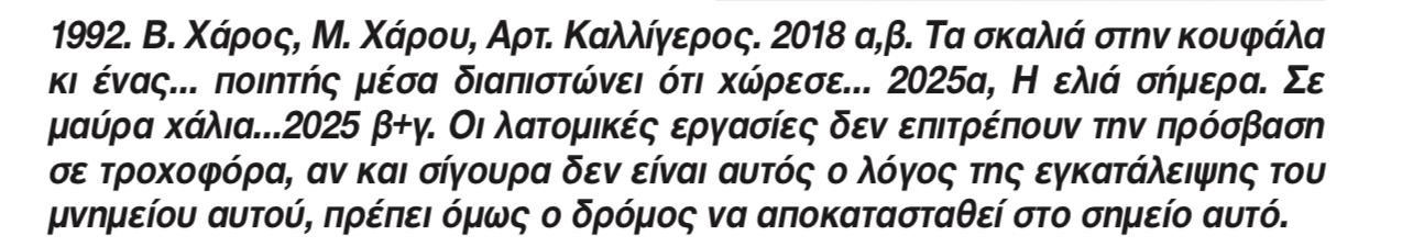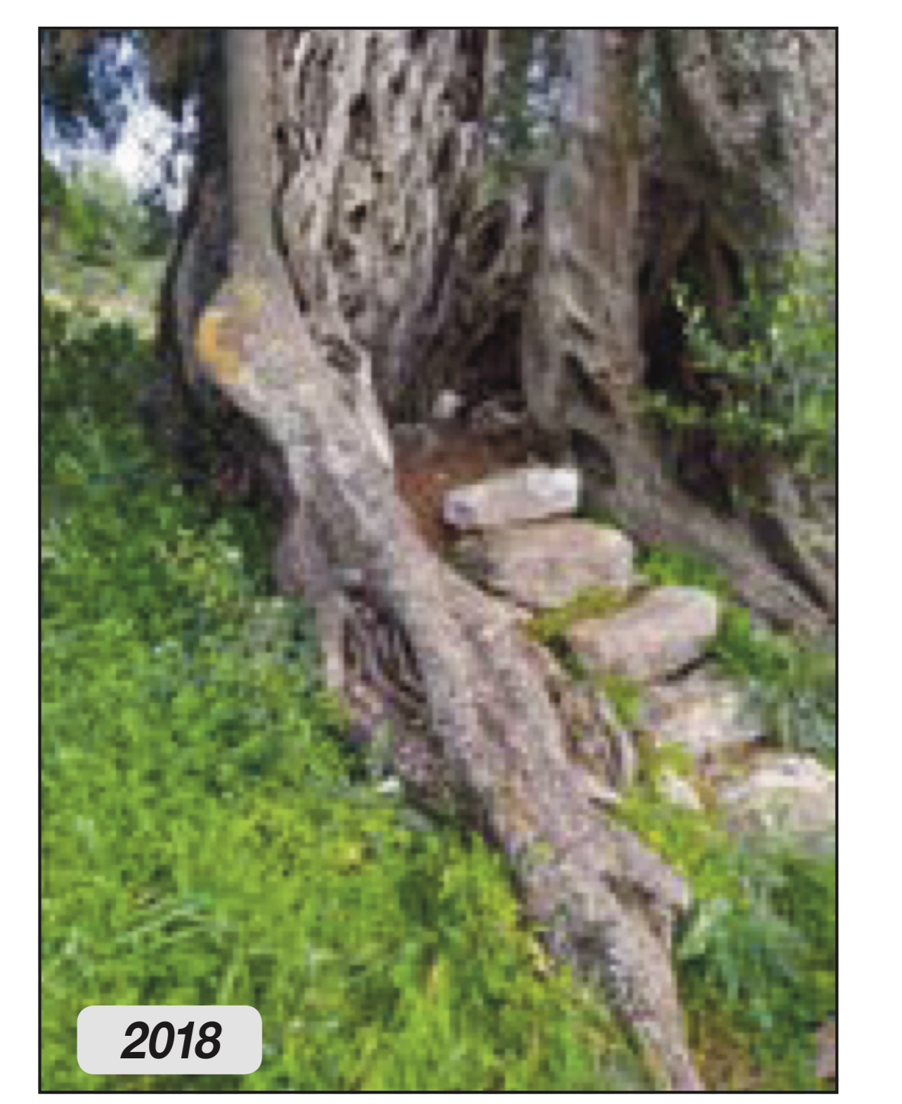 Κάπου 25 χρόνια αργότερα, το 2018, μία άλλη ομάδα (Γ. Δρυμωνιάτης, Α. Κονταράτος, Χ. Σούγιαννης, Α. Λουράντος. Μ. Αγγελιουδάκηςκαι Ι. Καψάλης) κάναμε την ίδια διαδρομή και φύγαμε με μία απογοήτευση, καθώς το περήφανο δέντρο, το οποίο, εκτός από 3 ιδιοκτήτες στο παρελθόν, λέγεται ότι είχε κλαδιά από τρεις ποικιλίες ελιάς, είχε συρρικνωθεί αρκετά, εξακολουθούσε όμως να είναι το ίδιο εντυπωσιακό, αλλά ακόμη σε πλήρη εγκατάλειψη, αφού κανείς δεν είχε δείξει κανένα ενδιαφέρον για τη σωτηρία του και την ανάδειξή του. Ίσως έφταιγε και το γεγονός ότι ο δρόμος αποθάρρυνε όσους ήθελαν ενδεχομένως να πάνε να το δουν. Για να το προστατεύσουν δεν το συζητάμε….. Φέτος, μία καλή φίλη μάς είπε ότι επιχείρησε να φτάσει εκεί, αλλά ο δρόμος είχε κοπεί από λατομικές εργασίες! Την επομένη ξεκινήσαμε για την ίδια διαδρομή παρέα με καλό φίλο. 33 χρόνια μετά το τοπίο ήταν το ίδιο στο χώρο της ελιάς, αλλά ……η πρόσβαση, όντως, ήταν αδύνατη για οχήματα από εκτεταμένες λατομικές εργασίες εξόρυξης αμυγδαλόπετραςστις ιδιοκτησίες εκατέρωθεν του δρόμου, περίπου 1χλμ πριν από την κοιλάδα με το δέντρο και τα υλικά-υπολείμματα από την εξόρυξη εμπόδιζαν τη διέλευση οχημάτων. Παρά ταύτα φτάσαμε ως εκεί με τα πόδια, αλλά οποία απογοήτευση. Το μεγαλύτερο μέρος του δέντρου είχε πέσει στο έδαφος. Η κουφάλα με τα πέτρινα σκαλοπάτια είχε μερικώς καταρρεύσει κι αυτή και υπολογίσαμε ότι σε λίγα ακόμη χρόνια θα έχουν μείνει μόνο οι φωτογραφίες να θυμίζουν αυτό που ήταν εκεί κάποτε. Παρά ταύτα, υπάρχει ακόμη ελπίδα. Η φύση δεν παραδίδεται εύκολα και μερικά μεγάλα νεαρά κλαδιά στα ανατολικά, αν καθαριστεί το δέντρο κι ο γύρω χώρος, μπορούν να ξαναδώσουν μέρος της παλιάς του αίγλης και να το σώσουν για όσους ρομαντικούς δεν έχουν γίνει ακόμη δούλοι της ηλεκτρονικής …απραξίας. Πρώτα απ΄ όλα πρέπει να ασχοληθούν ασφαλώς οι ιδιοκτήτες και να φροντίσουν οι έχοντες το λατομείο να αποκαταστήσουν την πρόσβαση, καλλίτερα δε θα ήταν να αποκαθίσταται και κάθε λατομικός λάκκος μετά την αφαίρεση της πέτρας για να μην παραμένει ένα ξεκοιλιασμένο και άχαρο τοπίο, αν και νομίζουμε ότι αυτό επιβάλλεται να γίνεται γενικά σε κάθε εξόρυξη.