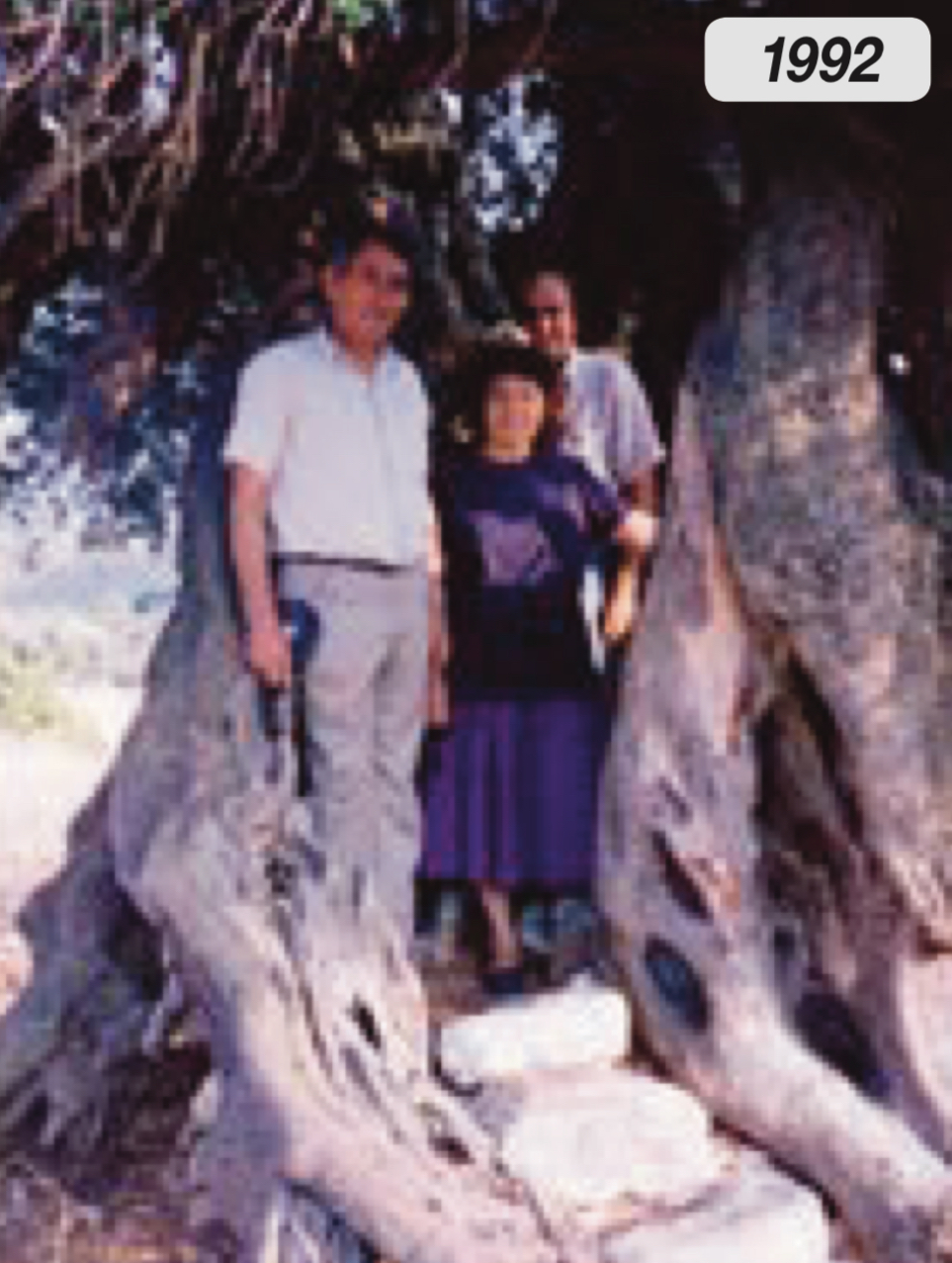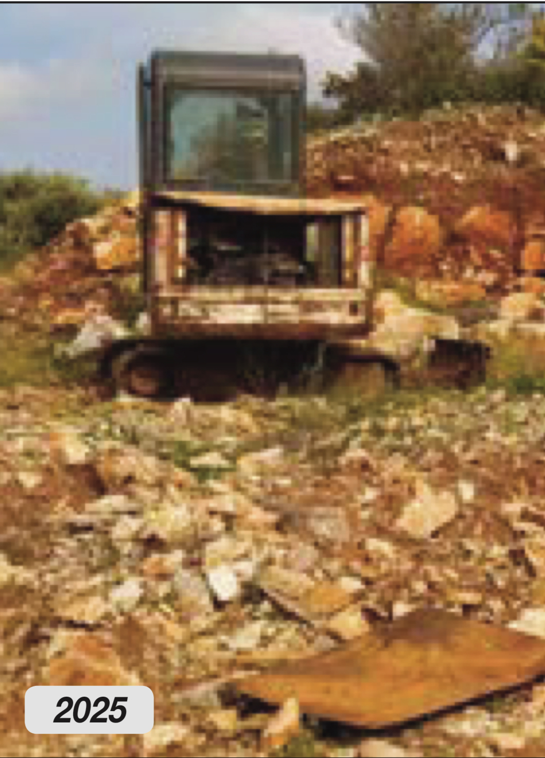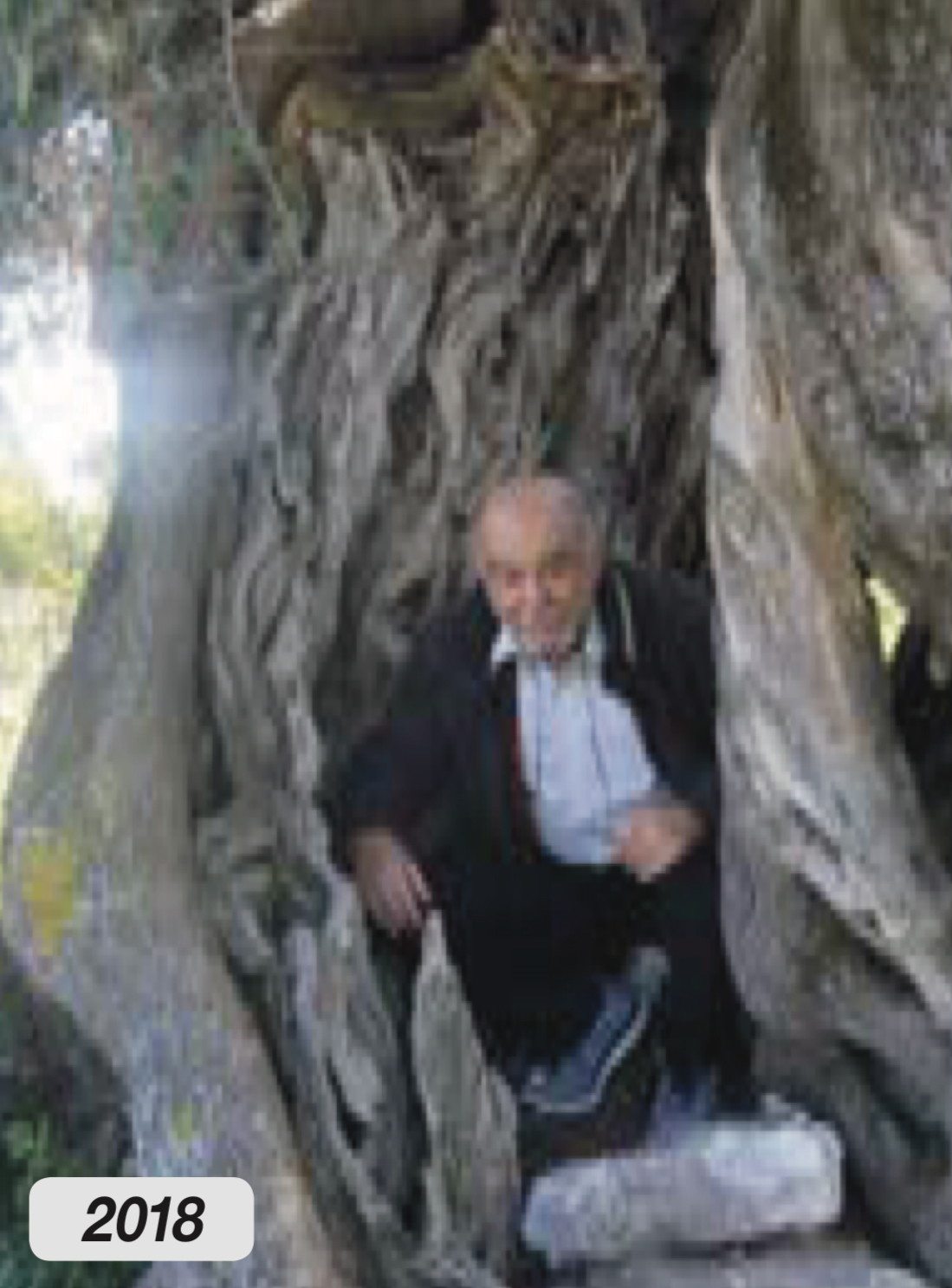 Κάπου 25 χρόνια αργότερα, το 2018, μία άλλη ομάδα (Γ. Δρυμωνιάτης, Α. Κονταράτος, Χ. Σούγιαννης, Α. Λουράντος. Μ. Αγγελιουδάκηςκαι Ι. Καψάλης) κάναμε την ίδια διαδρομή και φύγαμε με μία απογοήτευση, καθώς το περήφανο δέντρο, το οποίο, εκτός από 3 ιδιοκτήτες στο παρελθόν, λέγεται ότι είχε κλαδιά από τρεις ποικιλίες ελιάς, είχε συρρικνωθεί αρκετά, εξακολουθούσε όμως να είναι το ίδιο εντυπωσιακό, αλλά ακόμη σε πλήρη εγκατάλειψη, αφού κανείς δεν είχε δείξει κανένα ενδιαφέρον για τη σωτηρία του και την ανάδειξή του. Ίσως έφταιγε και το γεγονός ότι ο δρόμος αποθάρρυνε όσους ήθελαν ενδεχομένως να πάνε να το δουν. Για να το προστατεύσουν δεν το συζητάμε….. Φέτος, μία καλή φίλη μάς είπε ότι επιχείρησε να φτάσει εκεί, αλλά ο δρόμος είχε κοπεί από λατομικές εργασίες! Την επομένη ξεκινήσαμε για την ίδια διαδρομή παρέα με καλό φίλο. 33 χρόνια μετά το τοπίο ήταν το ίδιο στο χώρο της ελιάς, αλλά ……η πρόσβαση, όντως, ήταν αδύνατη για οχήματα από εκτεταμένες λατομικές εργασίες εξόρυξης αμυγδαλόπετραςστις ιδιοκτησίες εκατέρωθεν του δρόμου, περίπου 1χλμ πριν από την κοιλάδα με το δέντρο και τα υλικά-υπολείμματα από την εξόρυξη εμπόδιζαν τη διέλευση οχημάτων. Παρά ταύτα φτάσαμε ως εκεί με τα πόδια, αλλά οποία απογοήτευση. Το μεγαλύτερο μέρος του δέντρου είχε πέσει στο έδαφος. Η κουφάλα με τα πέτρινα σκαλοπάτια είχε μερικώς καταρρεύσει κι αυτή και υπολογίσαμε ότι σε λίγα ακόμη χρόνια θα έχουν μείνει μόνο οι φωτογραφίες να θυμίζουν αυτό που ήταν εκεί κάποτε. Παρά ταύτα, υπάρχει ακόμη ελπίδα. Η φύση δεν παραδίδεται εύκολα και μερικά μεγάλα νεαρά κλαδιά στα ανατολικά, αν καθαριστεί το δέντρο κι ο γύρω χώρος, μπορούν να ξαναδώσουν μέρος της παλιάς του αίγλης και να το σώσουν για όσους ρομαντικούς δεν έχουν γίνει ακόμη δούλοι της ηλεκτρονικής …απραξίας. Πρώτα απ΄ όλα πρέπει να ασχοληθούν ασφαλώς οι ιδιοκτήτες και να φροντίσουν οι έχοντες το λατομείο να αποκαταστήσουν την πρόσβαση, καλλίτερα δε θα ήταν να αποκαθίσταται και κάθε λατομικός λάκκος μετά την αφαίρεση της πέτρας για να μην παραμένει ένα ξεκοιλιασμένο και άχαρο τοπίο, αν και νομίζουμε ότι αυτό επιβάλλεται να γίνεται γενικά σε κάθε εξόρυξη.