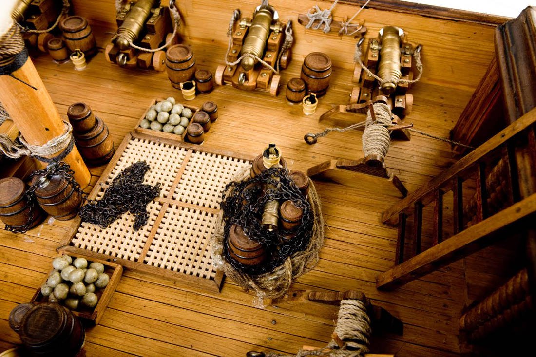 Ο θεατής επίσης μπορεί να περιηγηθεί στο εσωτερικό των πλοίων, μιας και είναι εξοπλισμένα με ασύλληπτη λεπτομέρεια ακόμη και στα πιο κρυφά τους σημεία, όπως: αμπάρια, καμπίνες, μαγειρεία, αποθήκες, εργαστήρια, οπλουργεία, γαλαρία των κωπηλατών, στάβλοι, πιθάρια, αμφορείς, δοχεία, ασκοί, βαρέλια, κιβώτια, κουβάδες, τσουβάλια με τρόφιμα και εφόδια, κρεβάτια, ανάκλιντρα, αιώρες, γραφεία, βιβλιοθήκες, καρέκλες, σκαμνιά, τραπέζια, έργα τέχνης, πίνακες, αγάλματα, ψηφιδογραφίες, φανοί, λυχνοστάτες και πολυέλαιοι.
