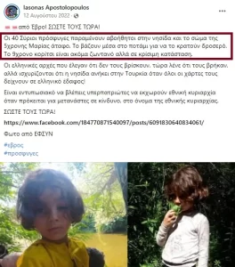 «Η Ελλάδα του κ. Μητσοτάκη αρνείται να κινητοποιηθεί σε πολιτικό επίπεδο, ακόμα και όταν διακυβεύονται ζωές παιδιών» σημειώνεται την ίδια ημέρα σε ανακοίνωση του ΣΥΡΙΖΑ. Στο μεταξύ η Αστυνομία εκδίδει ανακοίνωση, βρισκόμαστε πάντα στις 14/8/2022, στην οποία αναφέρει ότι δεν εντόπισε πρόσφυγες σε ελληνικό έδαφος: «Από την πρώτη στιγμή που υπήρξε πληροφόρηση για ενδεχόμενη παρουσία μεταναστών σε νησίδα στον Εβρο, η Ελληνική Αστυνομία έκανε αλλεπάλληλες έρευνες, καθώς και με κάθε πρόσφορο τεχνικό μέσο, χωρίς να εντοπιστεί ανθρώπινη παρουσία». «Δεν είναι δυνατόν να συνεχιστεί αυτό το σκηνικό αρχαίας τραγωδίας στα σύνορά μας» τονίζει (14/8) η γραμματέας της Κουμουνδούρου Ράνια Σβίγκου. Στις 15 Αυγούστου ακολουθεί ερώτηση των ευρωβουλευτών του ΣΥΡΙΖΑ Κούλογλου και Αρβανίτη προς την Ευρωπαϊκή Επιτροπή, όπου καταγγέλλεται στις Βρυξέλλες: «Νεκρή 5χρονη παραμένει άταφη». Την ίδια ημέρα η Αστυνομία ανακοινώνει τον εντοπισμό των προσφύγων σε σημείο «περίπου 4 χιλιόμετρα νοτίως, από τις συντεταγμένες εκτός της ελληνικής επικράτειας, που είχαν δηλωθεί ως αρχική θέση προ ημερών». Κυβέρνηση και ΣΥΡΙΖΑ συγκρούονται για την αρχική θέση των προσφύγων, αν βρίσκονταν δηλαδή σε ελληνικό ή σε τουρκικό έδαφος. Ο τομεάρχης Προστασίας του Πολίτη του ΣΥΡΙΖΑ, Χρήστος Σπίρτζης, δηλώνει ότι η νησίδα «εκεί που χάθηκε το 5χρονο κορίτσι, φαίνεται να είναι εγγεγραμμένη στο Ελληνικό Κτηματολόγιο». Ο Γιώργος Κατρούγκαλος απαιτεί κι αυτός η κυβέρνηση να ζητήσει συγγνώμη.