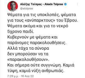 Στις 16 Αυγούστου παρεμβαίνει στο ζήτημα ο πρόεδρος του ΣΥΡΙΖΑ, Αλέξης Τσίπρας. Εγκαλεί την κυβέρνηση Μητσοτάκη για «το νεκρό 5χρονο παιδί» και συνδέει το θέμα με την υπόθεση των υποκλοπών που βρίσκεται ψηλά στην επικαιρότητα. «Καμιά τύψη, καμιά νύξη ανθρωπιάς» καταλήγει ο (τότε) αρχηγός της αντιπολίτευσης.