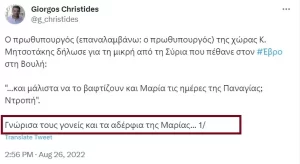 Στις 26 Αυγούστου ο Μητσοτάκης αναφέρεται στη Βουλή -στη συζήτηση για τις υποκλοπές- σε όσα πολύ βαριά ακούγονται για το ζήτημα του Εβρου: «Δεν γίνεται να υπάρχουν δυνάμεις σε αυτή την χώρα που να σιγοντάρουν με ψέματα και ότι η Ελλάδα άφησε ένα μωρό να πεθάνει και το βάφτισαν και Μαρία την ημέρα της Παναγίας. Ντροπή να λέγονται τέτοια πράγματα».