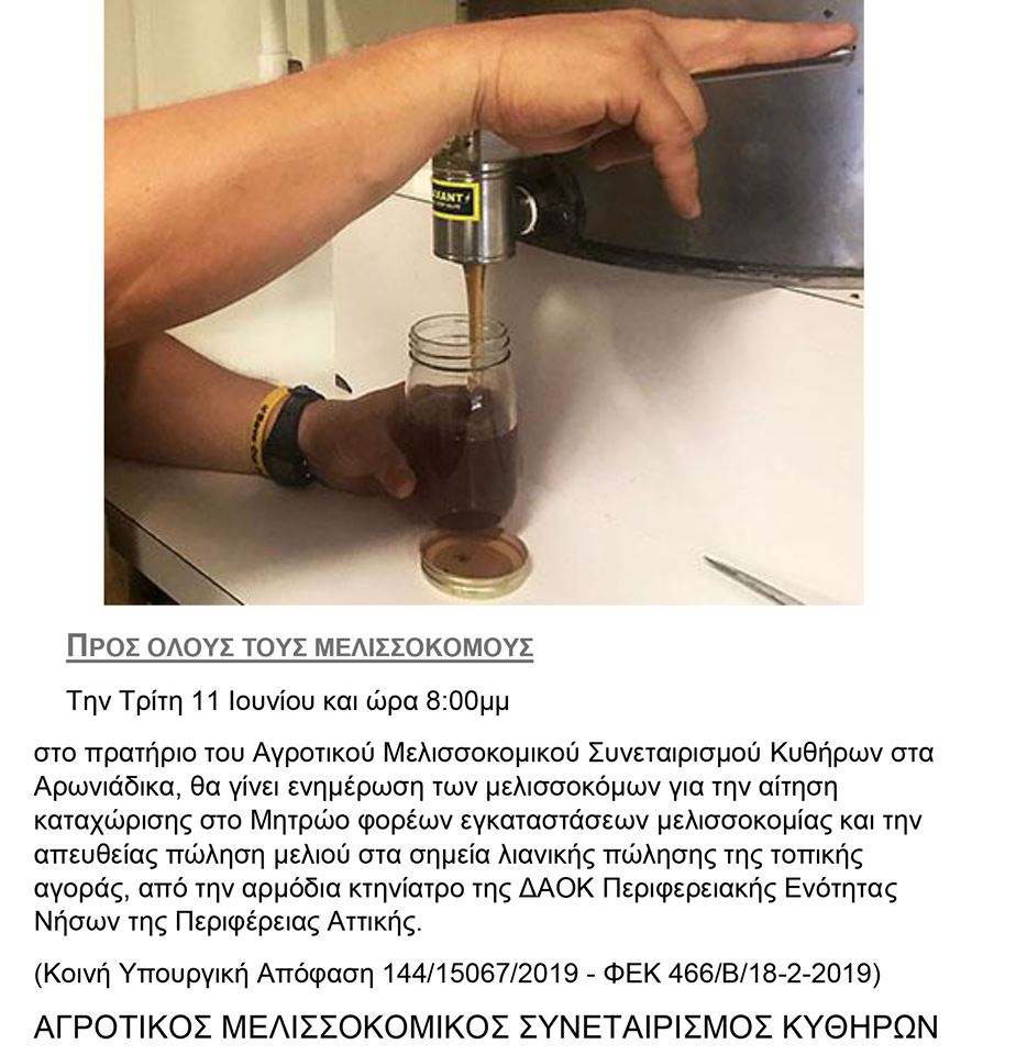 - Ενημέρωση των μελισσοκόμων για την αίτηση καταχώρισης στο μητρώο φορέων εγκαταστάσεων μελισσοκομίας την Τρίτη 11 Ιουνίου
