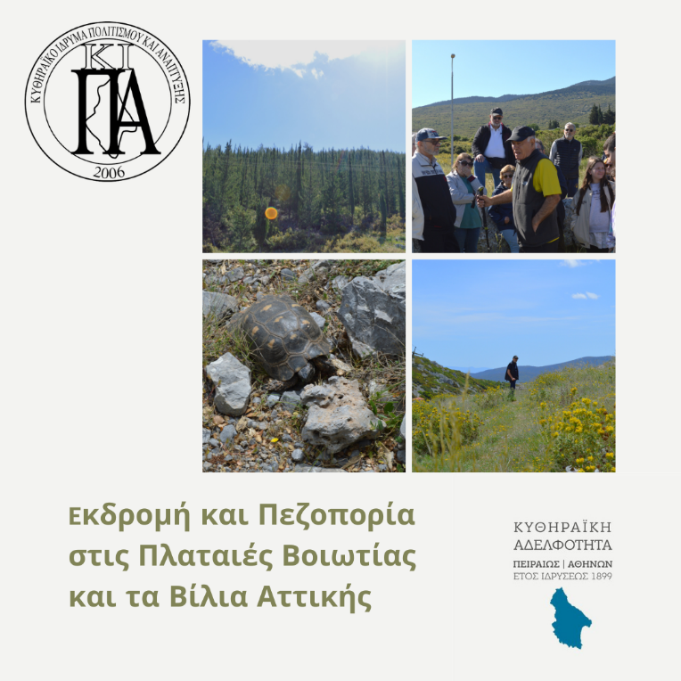 Στις 21 Απριλίου το ΚΙΠΑ και η Κυθηραϊκή Αδελφότητα Πειραιώς Αθηνών οργάνωσαν με επιτυχία ημερήσια εκδρομή και πεζοπορία στις Πλαταιές Βοιωτίας και τα Βίλια Αττικής, κάνοντας ένα βήμα για κοινές δράσεις.