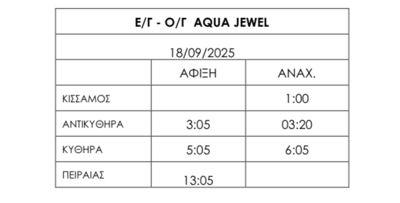 Τροποποίηση του δρομολογίου του πλοίου Aqua Τζούελ αύριο Πέμπτη 18 Σεπτεμβρίου από Κίσσαμο, Αντικύθηρα, Κύθηρα για Πειραιά ως εξής: