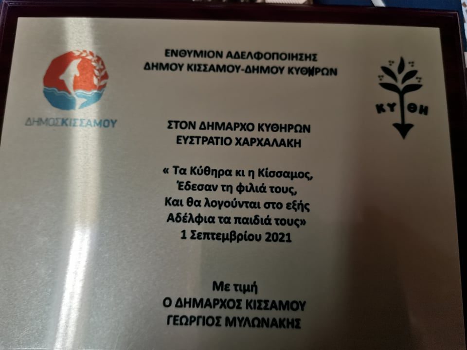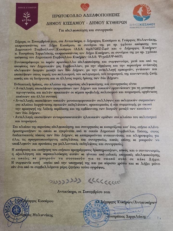 Με μια λιτή, αλλά συγκινητική τελετή, επισημοποιήθηκε την Τετάρτη 1 Σεπτεμβρίου 2021 στο νησί των Αντικυθήρων, η αδελφοποίηση των Δήμων Κισσάμου και Κυθήρων, μετά από σχετικές αποφάσεις των 2 Δημοτικών Συμβουλίων. Το πρωτόκολλο αδελφοποίησης υπέγραψαν στο Γραφείο της Κοινότητας Αντικυθήρων ο Δήμαρχος Κισσάμου Γεώργιος Μυλωνάκης και ο Δήμαρχος Κυθήρων και Αντικυθήρων Ευστράτιος Χαρχαλάκης, παρουσία των Δημάρχων Χανίων Παναγιώτη Σημανδηράκη, Σφακίων Μανούσου Χιωτάκη και Γαύδου Λίλιαν Στεφανάκη καθώς και του Προέδρου της Κοινότητας Αντικυθήρων Γεωργίου Χαρχαλάκη.