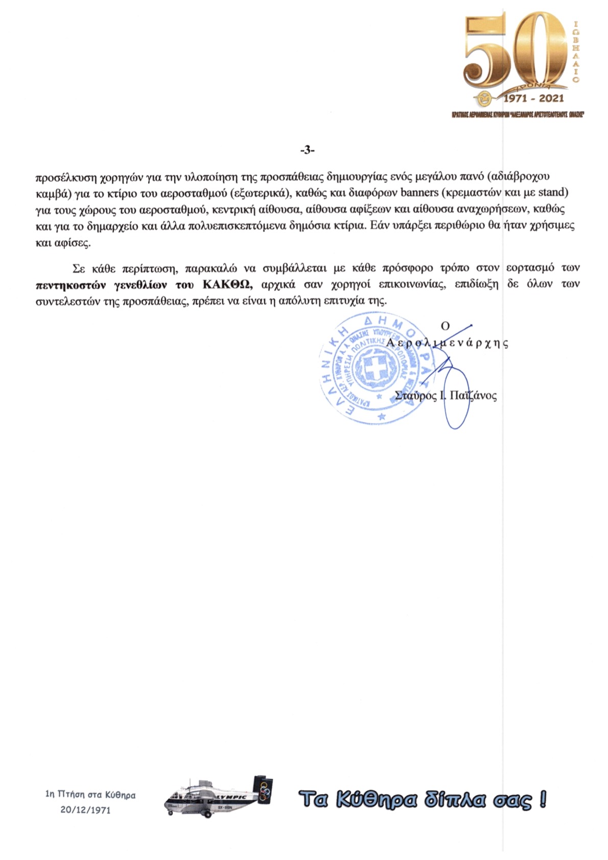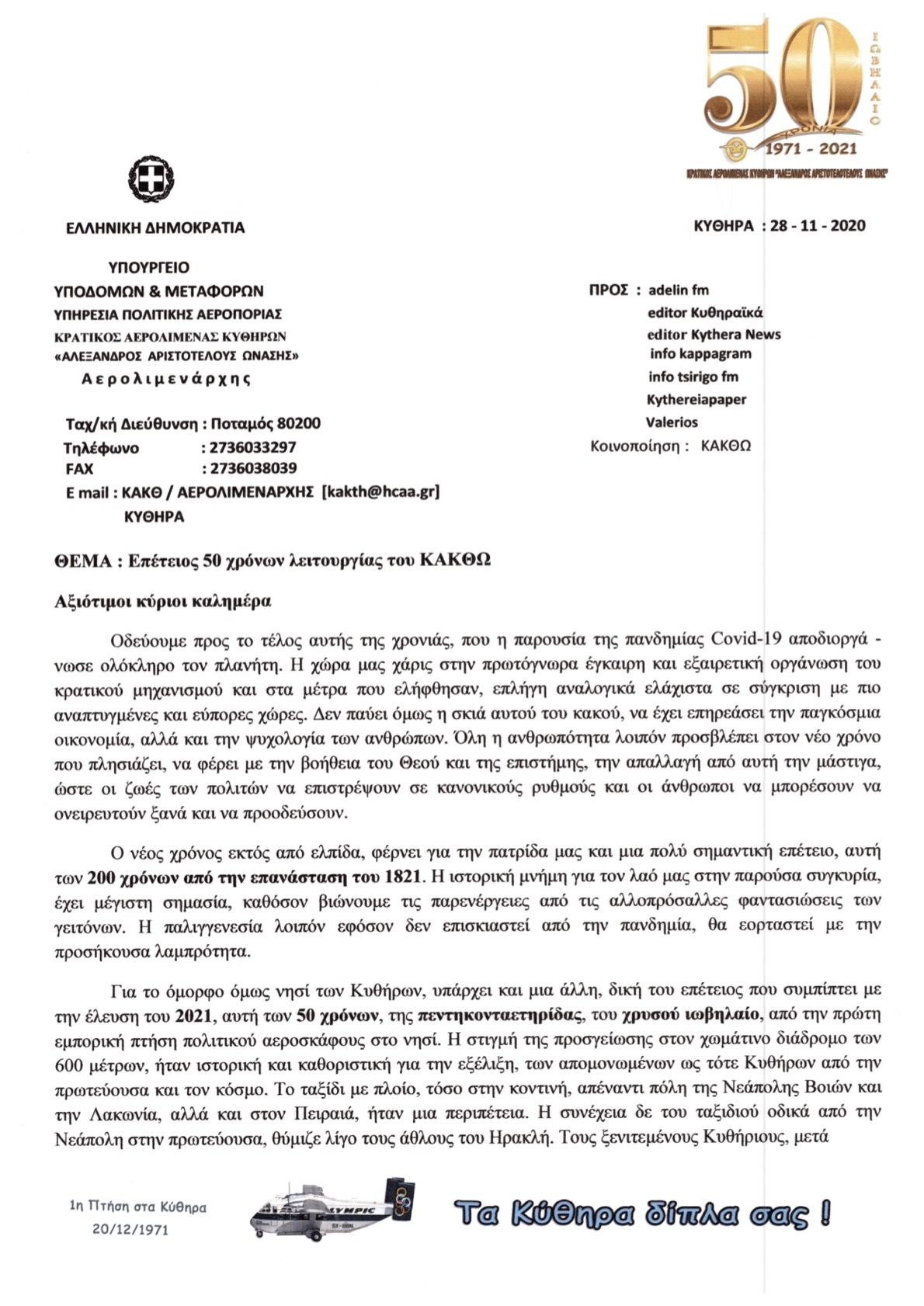 - ΕΠΙΣΤΟΛΗ ΠΡΟΣ Μ.Μ.Ε. ΚΥΘΗΡΩΝ ΓΙΑ ΤΑ 50 ΧΡΟΝΙΑ ΤΟΥ ΚΑΚΘΩ