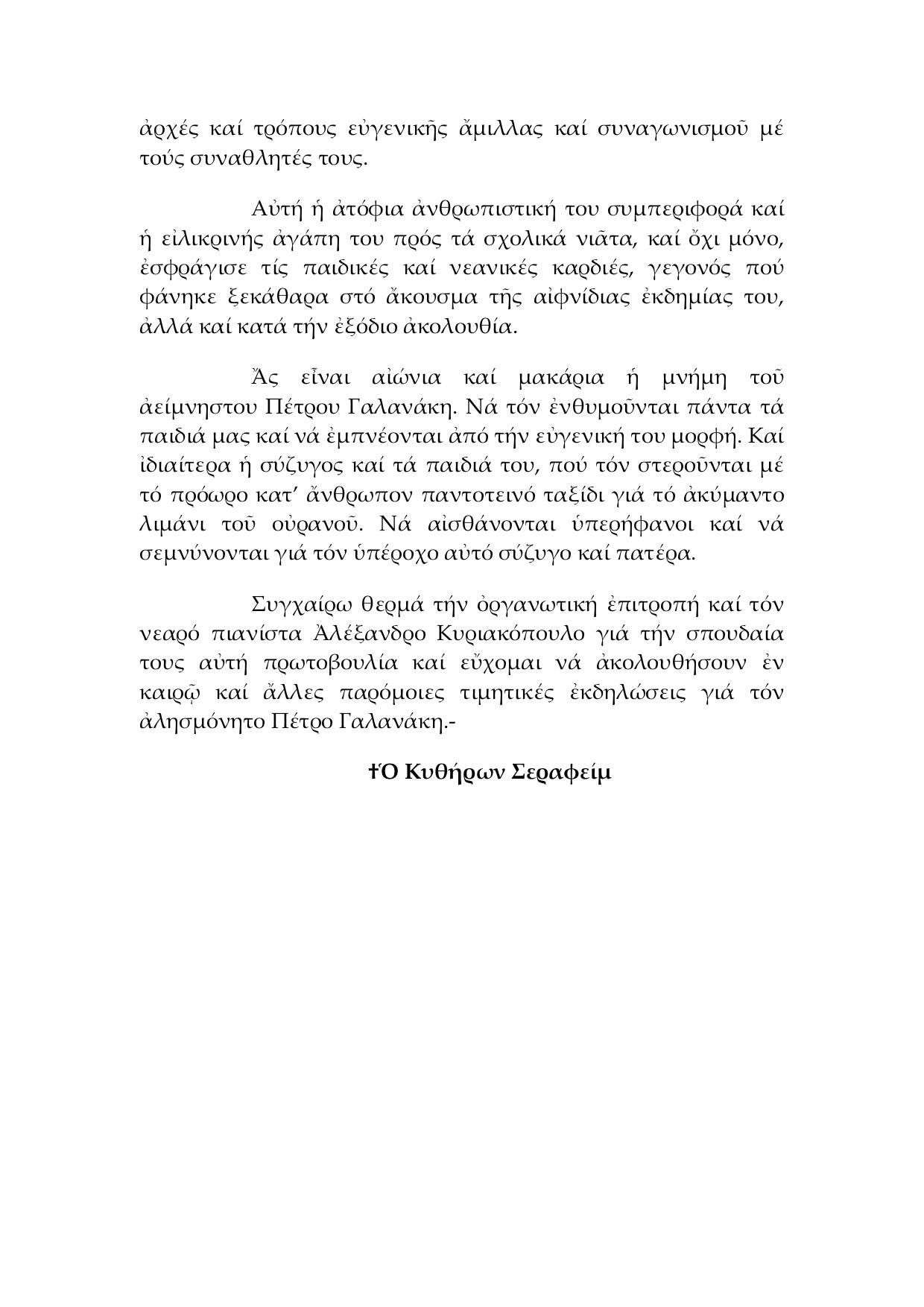 Επιστολή Σεβ. Μητρ. Κυθήρων Σεραφείμ – Τιμητική εκδήλωση για τον αλησμόνητο Πέτρο Γαλανάκη