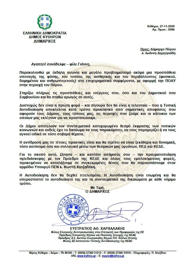 Eπιστολή υποστήριξης στο Δήμαρχο Πόρου από το Δήμαρχο Κυθήρων