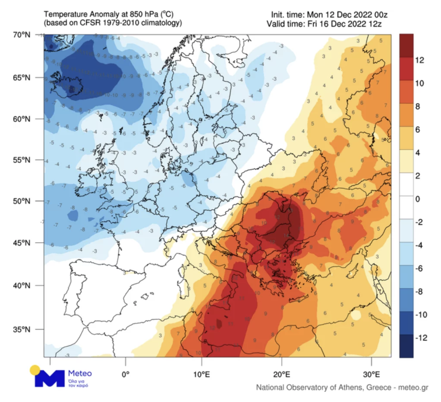 Στον προγνωστικό χάρτη του meteo.gr (12-16 Δεκεμβρίου) φαίνονται με αριθμούς οι αποκλίσεις από τις κανονικές τιμές της θερμοκρασίας: