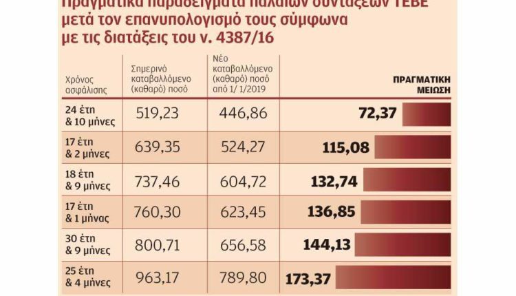 Είναι χαρακτηριστικά τα παραδείγματα που παρουσίασε χθες η ομοσπονδία των εργαζομένων στα ασφαλιστικά ταμεία (ΠΟΠΟΚΠ), για το πόσο θα μειωθούν οι παροχές ανθρώπων που για 20 με 25 χρόνια πλήρωναν εισφορές για να πάρουν τελικά σύνταξη λίγο πάνω από τα 500 ευρώ. Πρόκειται για πραγματικές περιπτώσεις συνταξιούχων του πρώην ΤΕΒΕ, που σήμερα λαμβάνουν συντάξεις έως 1.000 ευρώ μεικτά, αλλά και συντάξεις θανόντων που μετά τον υπολογισμό με βάση τον νόμο Κατρούγκαλου καταλήγουν στους επιζώντες δικαιούχους ως… προνοιακή παροχή.