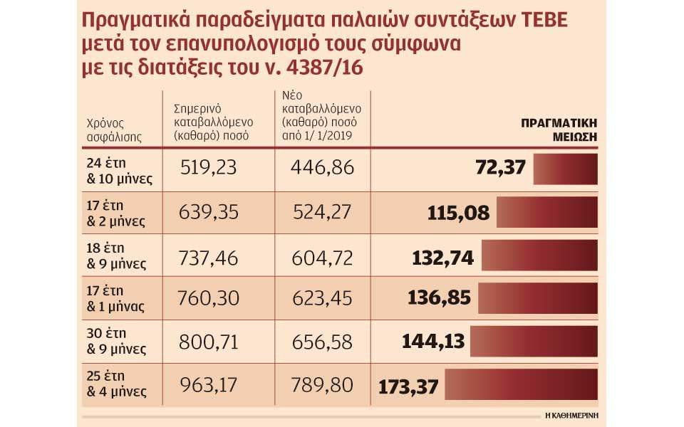 Αναλυτικά, σύμφωνα με τα στοιχεία της ομοσπονδίας των εργαζομένων, πρώην ελεύθερος επαγγελματίας με 24 χρόνια ασφάλισης και 10 μήνες, σήμερα, λαμβάνει μεικτά 552,37 ευρώ. Ο επανυπολογισμός έδειξε ότι θα πρέπει να πάρει 475,38 ευρώ μεικτά, ήτοι προσωπική διαφορά 76,99 ευρώ, που θα κοπεί ολόκληρη από τον Δεκέμβριο του 2018 (καταβολή σύνταξης Ιανουαρίου 2019). Στο χέρι, από 519,23 ευρώ θα λάβει σε λίγους μήνες 446,86 ευρώ (μείον 72,37 ευρώ καθαρά).