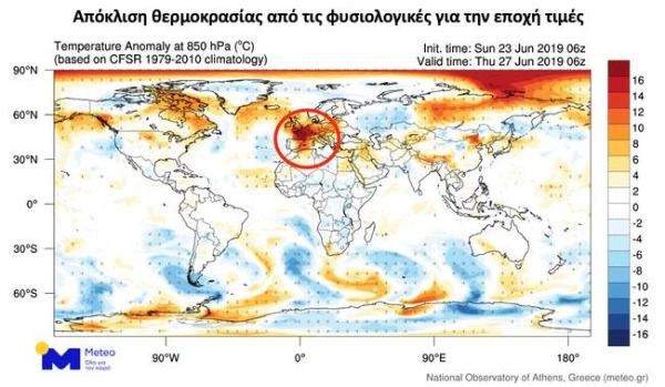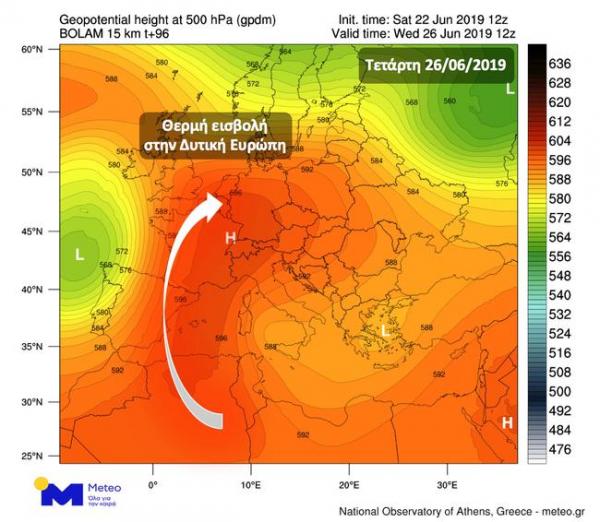 Η Ελλάδα δεν θα επηρεαστεί άμεσα από τον καύσωνα της Δυτικής Ευρώπης, τουλάχιστον έως το Σαββατοκύριακο 29-30 Ιουνίου, καθώς θα βρίσκεται κάτω από την επιρροή ενός βαρομετρικού χαμηλού, που θα οδηγήσει σε άστατο καιρό και φυσιολογικές για την εποχή θερμοκρασίες με μέγιστες τιμές γύρω στους 32 έως 35 βαθμούς Κελσίου.