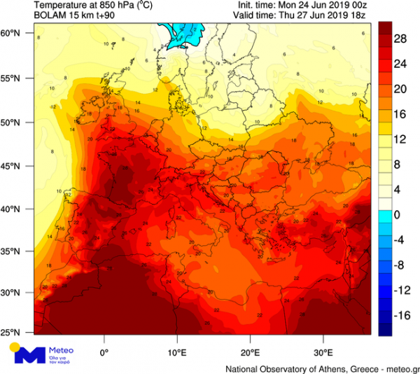 Ο παρακάτω χάρτης δείχνει την πρόγνωση της θερμοκρασίας στο επίπεδο περί των 1.500 μ. (το επίπεδο όπου μελετάμε την κίνηση των αερίων μαζών) την Πέμπτη 27 Ιουνίου και διακρίνονται με αποχρώσεις του κόκκινου οι πολύ θερμές αέριες μάζες που κατακλύζουν την Ευρώπη.