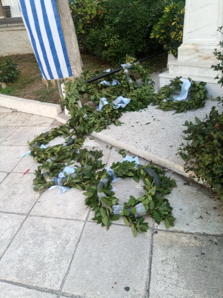 Δυστυχώς, ακόμη και  να «σπάζουν πλάκα», μόνο θλίψη προκαλούν ενέργειες όπως αυτή, να βρεθούν στην κατάσταση που βλέπετε τα στεφάνια στο μνημείο των πεσόντων στη Χώρα την επομένη της Εθνικής Εορτής. ΝΤΡΟΠΗ!
