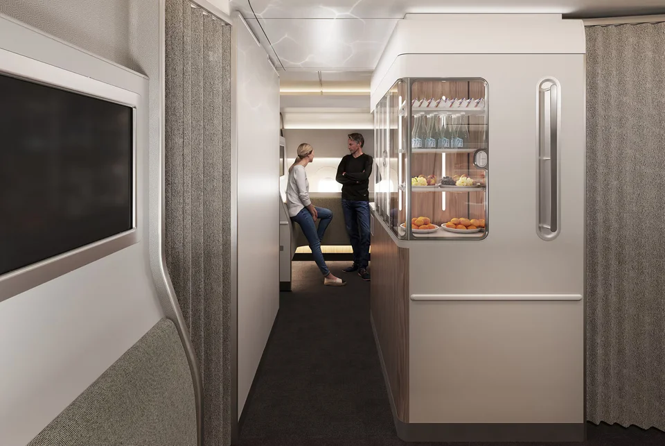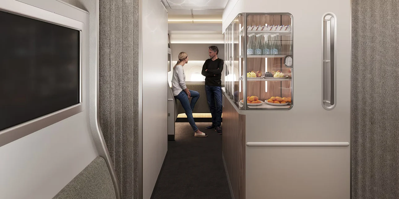 Οι επιβάτες της οικονομικής θέσης θα έχουν επίσης πρόσβαση σε μια αεροπορική πρωτοτυπία – μια ζώνη ευεξίας , έναν χώρο αφιερωμένο στην κίνηση, την κοινωνικοποίηση και την αναψυχή.