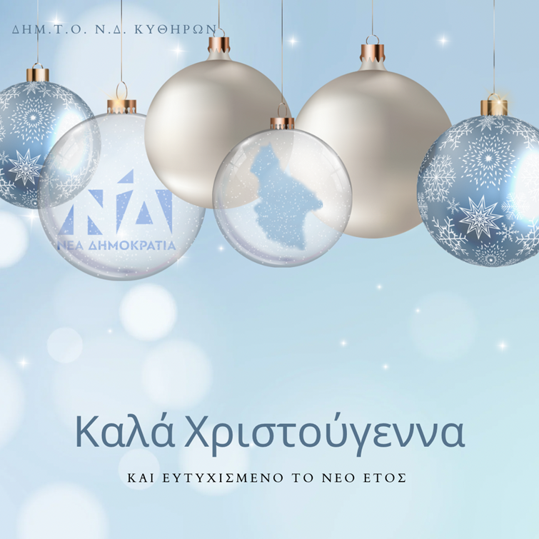 Ο Πρόεδρος της ΔΗΜ. Τ.Ο. Ν.Δ. Κυθήρων Μαυρομμάτης Π. Αντώνιος και τα μέλη Βάρδα Μαρία, Γεωργιλάς Παρασκευάς, Δαπόντε Εύη, Καλλίγερος Γεώργιος, Παπαγεωργίου Μυρτώ, Πρωτοψάλτης Δημήτριος και Σοφίος Ιωάννης, σας εύχονται Καλά Χριστούγεννα με αγάπη και υγεία για ένα δημιουργικό και ευτυχισμένο 2025!