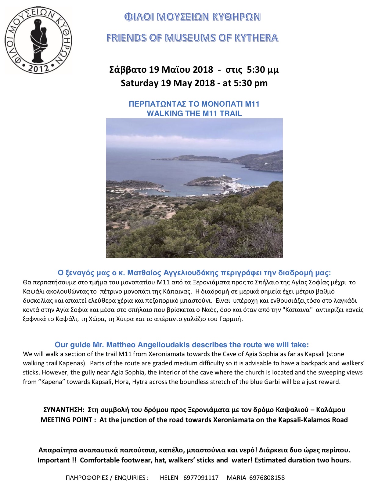 Φίλοι Μουσείων Κυθήρων – Ανακοίνωση για την προγραμματισμένη πεζοπορία στο Μονοπάτι Μ11