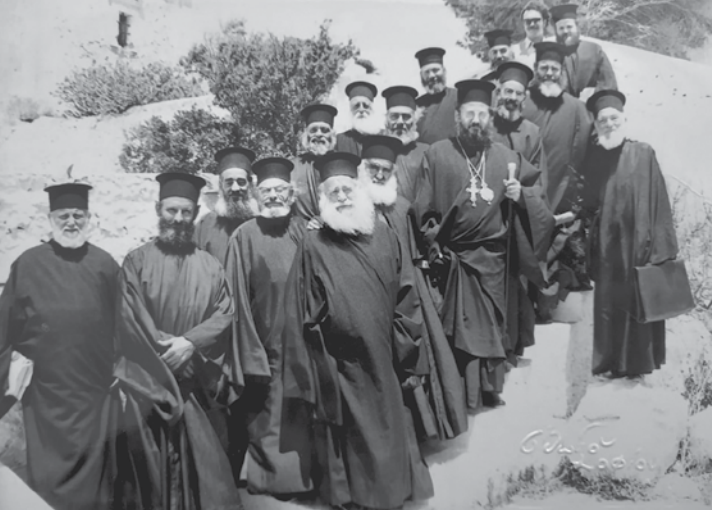 Διακρίνονται κατά σειρά από την αρχή και από αριστερά: Σταύρος Χάρος, Χρήστος Καλλίγερος, Μελέτιος Κλεούδης, Τιμολέων Τσέλλος, Αλέξανδρος Μαγκουρής, Ευθύμιος Καλλίγερος. Δίπλα από το Μητροπολίτη, Γεώργιος Λουράντος και Άνθιμος Βενέρης, Ηλίας Χανιώτης και πίσω, Κυριάκος Ποτήρης, Ευάγγελος Λουράντος, Ανδρέας Καλλίγερος, Γεώργιος Μεγαλοκονόμος και Γεώργιος Χατζηδάκης. Δεξιά, έξω από την ομάδα, ο Εμμανουήλ Ζερβός και ο λαϊκός πίσω, ο τότε οδηγός της Μητρόπολης Νικόλαος Δάβαρης. (Η φωτογραφία είναι του Εμμ. Σοφίου).