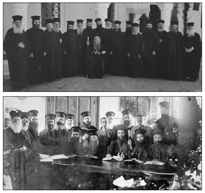 ΣΤΗΝ πρώτη, που χρονολογείται το 1939 είναι το τοποτηρητής Μητροπολίτης Κυθήρων Προκόπιος Καλλιοντζής με τους ιερείς του νησιού στο Ηγουμενείο στα Μυρτίδια. Η φωτογραφία είναι κατεστραμμένη και δεν διακρίνονται όλοι, ενώ οι περισσότεροι δεν είναι γνωστοί. Η κάτοχός της μας ανέφερε ότι αριστερά στο Μητροπολίτη είναι ο παπά Σταύρος Χάρος και δίπλα του ο παπά Μανώλης Καλλίγερος-Κουρμουλής. Πίσω από το Μητροπολίτη με τη μακριά γενειάδα πρέπει να είναι ο παπά Κυριάκος Χλαμπέας, ενώ διακρίνονται ακόμη ο παπά Γιώργης Κασιμάτης-Καρτσούρης, ο παπά Καλλίγερος (Λοχαγός) από το Στραπόδι, ένας παπά Σκλάβος, όπως κι ο παπά Ι. Κορωναίος.