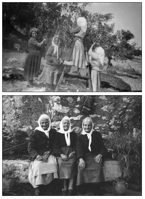 Στην άλλη φωτογραφία φαίνονται αυτές οι τρεις, γνωστές ως Ρουσσοπούλες, από το παρωνύμιο Ρούσσος της οικογένειας Γιαννιώτη-Ρούσσου. Είναι η Διαμάντα, η Παναγιώτα και η Σταμάτα. Για να γυρίσουμε στην πρώτη φωτογραφία, εκτός από αυτές τις τρεις, που είναι πάνω στην ελιά, ο φακός εστιάζει σε μία γυναίκα, που μαζεύει μαζί τους, την Ηρώ Εμμ. Δολομίδη και μία άλλη που κάθεται μαζί με τα παιδιά της, αλλά δεν έχουμε βεβαιότητα ποία είναι. Μία εποχή λίγες δεκαετίες πίσω τόσο γεμάτη σε αναμνήσεις.