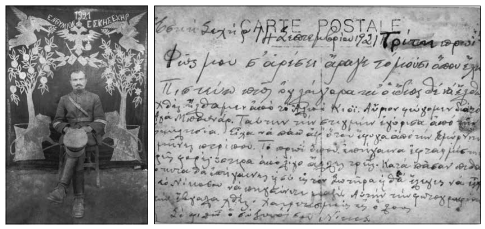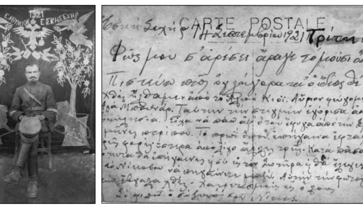 Μία φωτογραφία Κυθηραϊκού ενδιαφέροντος από τη Μικρασιατική εκστρατεία, που είχε σταλεί στη σύζυγο Κυθηρίου στρατιώτη από το Κάτω Λειβάδι από το σύζυγό της. Φέρει ημερομηνία 14 Σεπτεμβρίου 1921, πριν 100 χρόνια δηλαδή και είχε τραβηχτεί την προηγούμενη. Προφανώς αναφέρει μόνον όσα επιτρέπονταν από τη στρατιωτική λογοκρισία, αλλά φαίνεται ότι είχε αρχίσει η οπισθοχώρηση σύμφωνα με μία αναφορά. Ο αποστολέας είναι ο Νικόλαος Γιαννιώτης (Μπογιατζής) και διασώθηκε από το δισέγγονό του Σταμάτη Νικ. Γιαννιώτη, που έχει τροφοδοτήσει τη στήλη μας πολλές φορές. Πίσω από τη φωτογραφία διαβάζουμε: