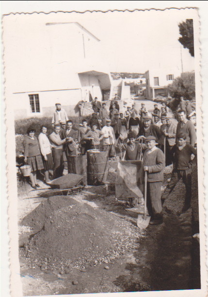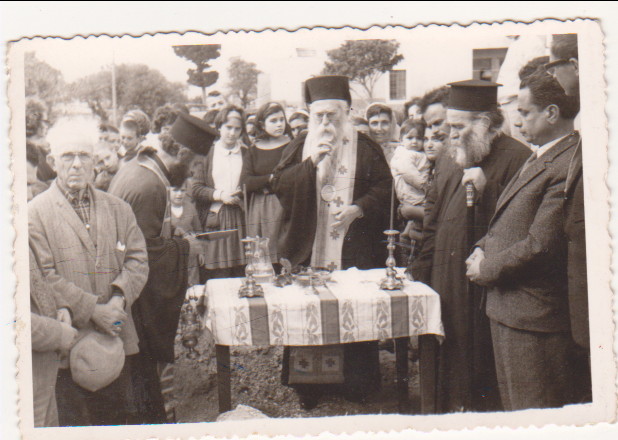 Στη δεύτερη φωτογραφία ο αγιασμός από την έναρξη εργασιών τσιμεντόστρωσης στο Κάτω Λειβάδι. Διακρίνεται ο Μητροπολίτης Μελέτιος Γαλανόπουλος, ο ιερέας Σταύρος Χάρος, ο δάσκαλος Ιω. Μασσέλος, ο Εμμ. Καραβουσάνος (Σαρλώ) και ο Σπύρος Γιαννιώτης. Ο ιερέας που δεν διακρίνεται καθαρά πρέπει να είναι ο Γεώργιος Νοταράς. Πίσω διακρίνονται μαθητές και λίγοι κάτοικοι. Πρέπει να είναι 1965-1966.